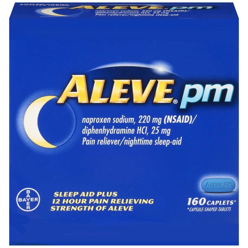 Aleve pm is the first and only over the counter otc pm product with the 12 hour pain relieving strength of aleve plus a sleep aid.