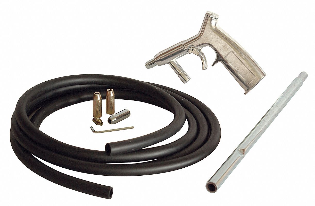 Includes gun 4 nozzles air regulator and blast gloves.